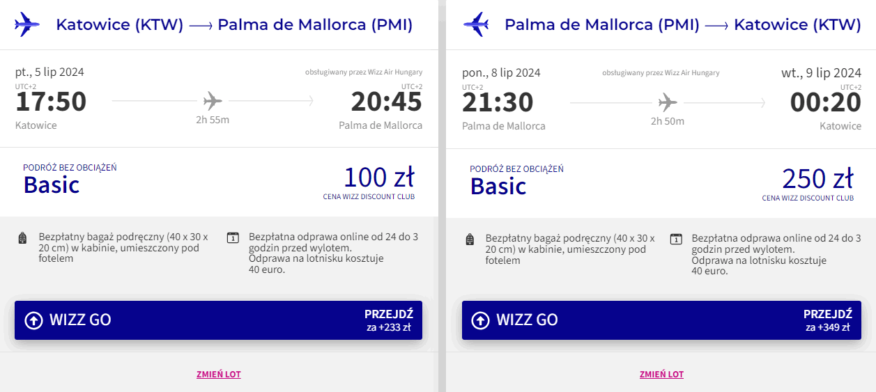 Na Majorkę polecisz z portu lotniczego Katowice-Pyrzowice w terminie 5-8 lipca (piątek-poniedziałek). W obie strony podróżować będziesz bezpośrednio linią Wizz Air z bagażem podręcznym. Bilety w najniższej cenie dostępne są dla członków Wizz Discount Club. Chętni na loty bez WDC zapłacą więcej.