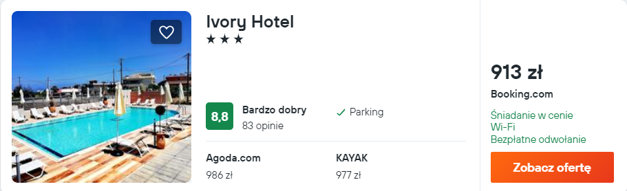 Na Rodos rekomenduję ci noclegi z codziennymi śniadaniami w 3* hotelu Ivory z odkrytym basenem oraz bezpłatnym parkingiem. W każdym pokoju znajduje się mały aneks kuchenny oraz łazienka. Na terenie całego obiektu będziesz mieć zapewniony dostęp do sieci WiFi.