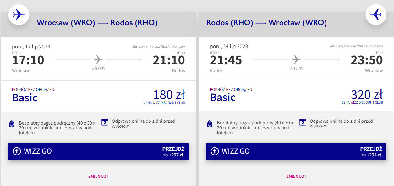 Na Rodos podróżować będziesz z wrocławskiego portu lotniczego im. Mikołaja Kopernika w terminie 17-24 lipca. W obie strony polecisz bezpośrednio na pokładzie samolotów linii Wizz Air z wliczonym małym bagażem podręcznym. Bilety w najniższej cenie dostępne są dla członków Wizz Discount Club. Chętni na loty bez WDC zapłacą więcej.