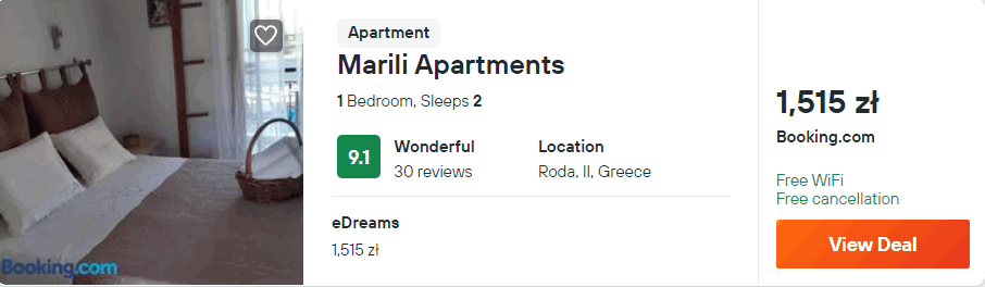 Na wyspie zakwaterowani będziecie w hotelu apartamentowym Marili Apartments, który znajduje się w miejscowości Sidari. Z lotniska w okolice miejsca noclegowego (przystanek Karousádes) dojedziecie autobusem lub wypożyczonym samochodem – szczegóły poniżej.