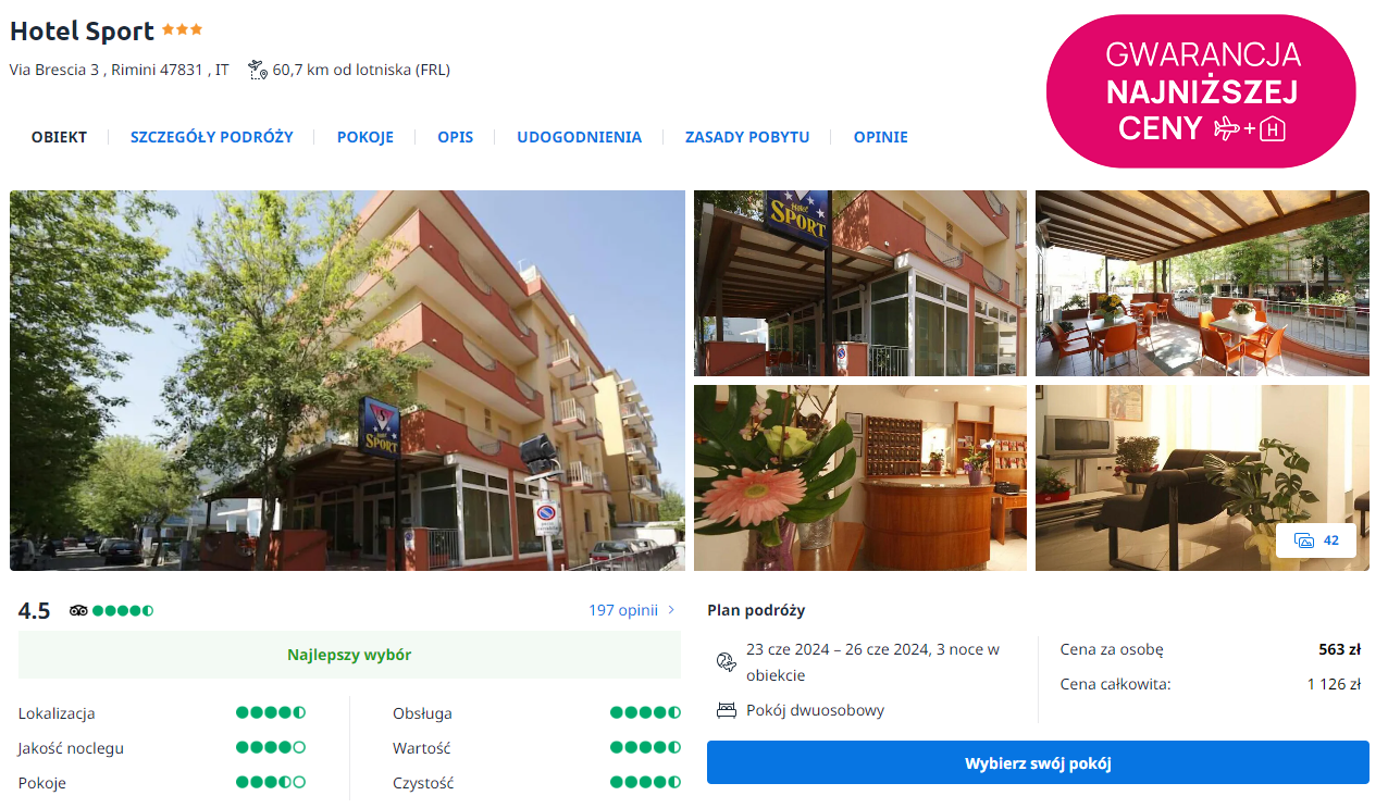 Będziesz zakwaterowany w pobliskim kurorcie Rimini. Zatrzymasz się tam w 3* hotelu Sport, który znajduje się w odległości krótkiego spaceru od plaży. W cenę pobytu wliczono codzienne śniadania.