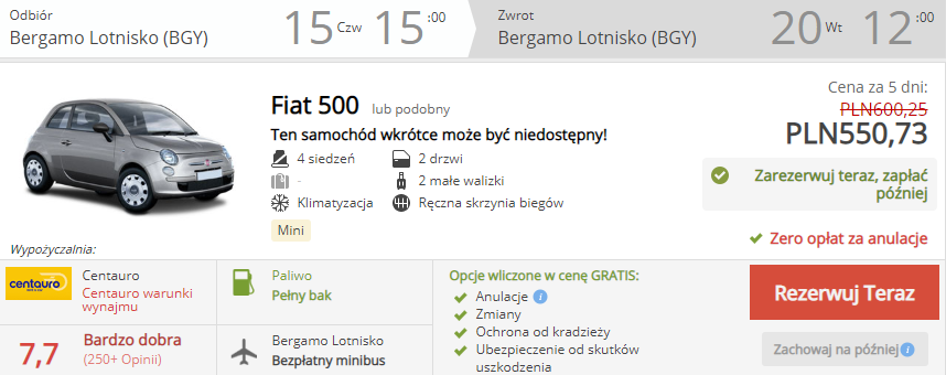 Za przeloty dla 2 osób zapłacicie 204 PLN (102 PLN/osoba). W jego cenę wlicozny jest tylko bagaż podręczny, dlatego sprawdźcie jak efektywnie się w niego spakować. Za 5-dniowe zakwaterowanie w hotelu ze śniadaniami 1060 PLN (530 PLN/osoba), a za wypożyczenie auta na czas pobytu – 550 PLN (275 PLN/osoba).