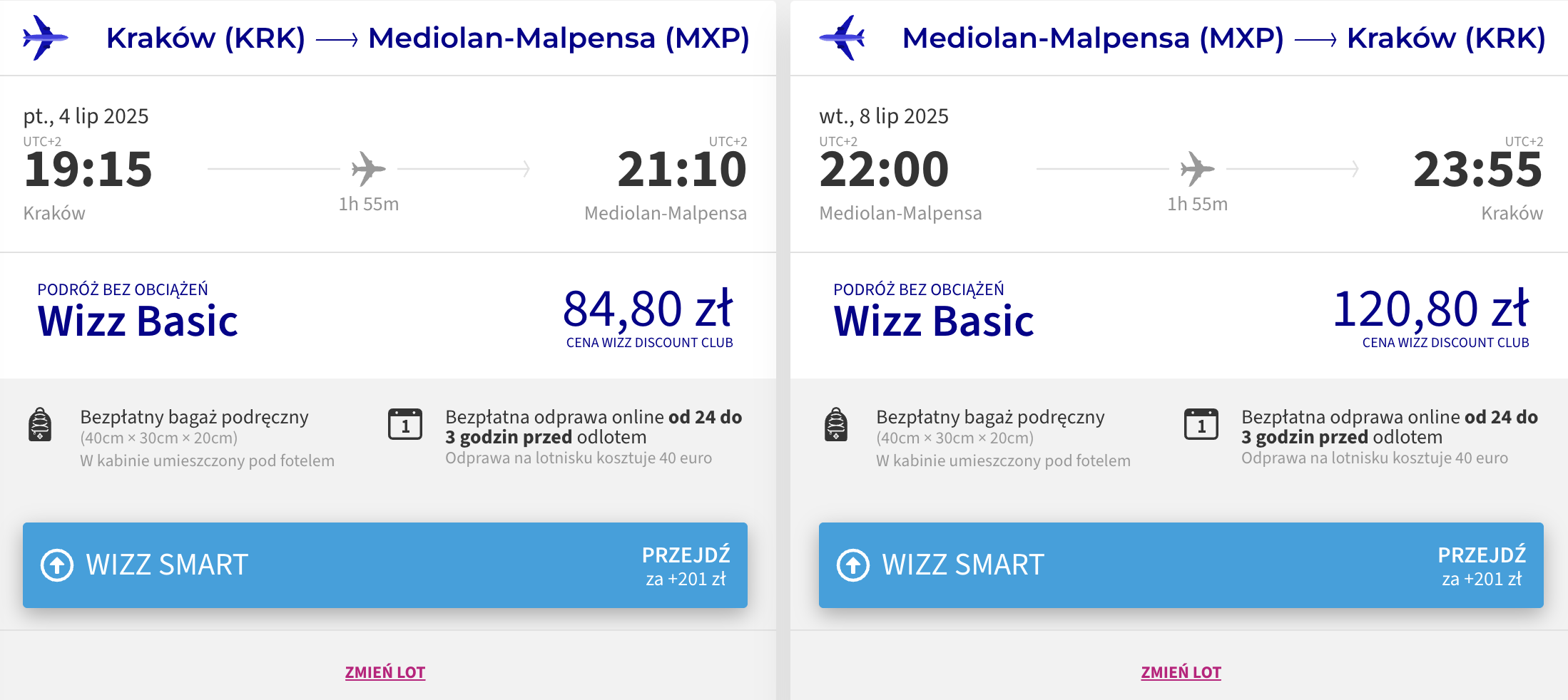 Do Mediolanu (Malpensa) wybierzesz się z lotniska w Krakowie w terminie 4 – 8 lipca (piątek-wtorek). Na Półwysep Apeniński polecisz linią Wizz Air. W cenie możesz zabrać ze sobą bagaż podręczny.