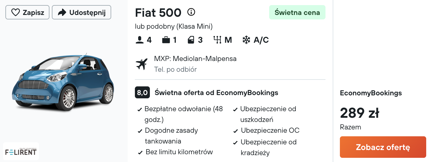 🚗 Wypożyczenie auta na czas pobytu: 289 PLN