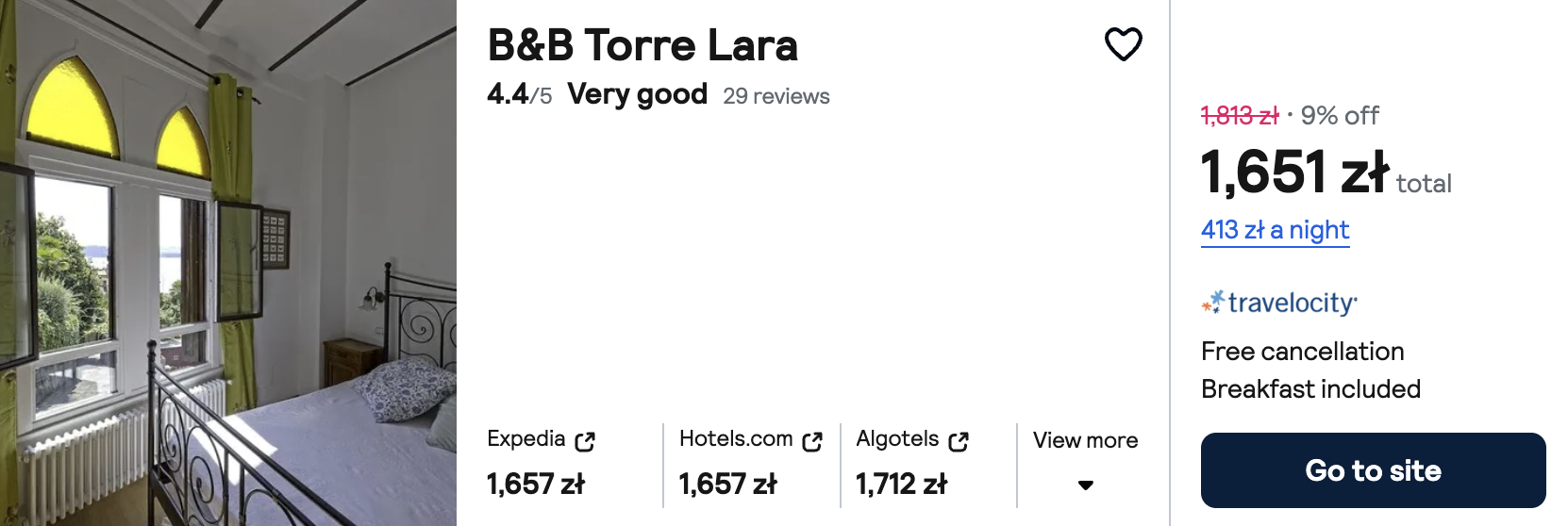 We Włoszech rekomenduję zakwaterowanie w bardzo dobrze ocenianym pensjonacie B&B Torre Lara. Kompleks położony jest blisko jeziora. W cenę wliczone są śniadania.
