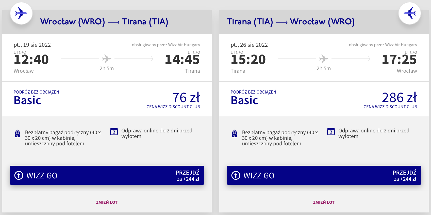 Do Tirany udacie się w terminie 19-26 sierpnia. Na Bałkany polecicie bezpośrednio z lotniska we Wrocławiu na pokładzie samolotu linii lotniczej Wizz Air. Pamiętajcie, że bilety w najniższej cenie dostępne są dla członków Wizz Discount Club. Chętni na loty bez WDC zapłacą nieco więcej.