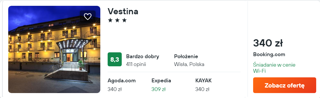 Hotel Vestina to nowocześnie urządzony obiekt zlokalizowany w Wiśle. W cenę zakwaterowania wliczono codzienne śniadania.