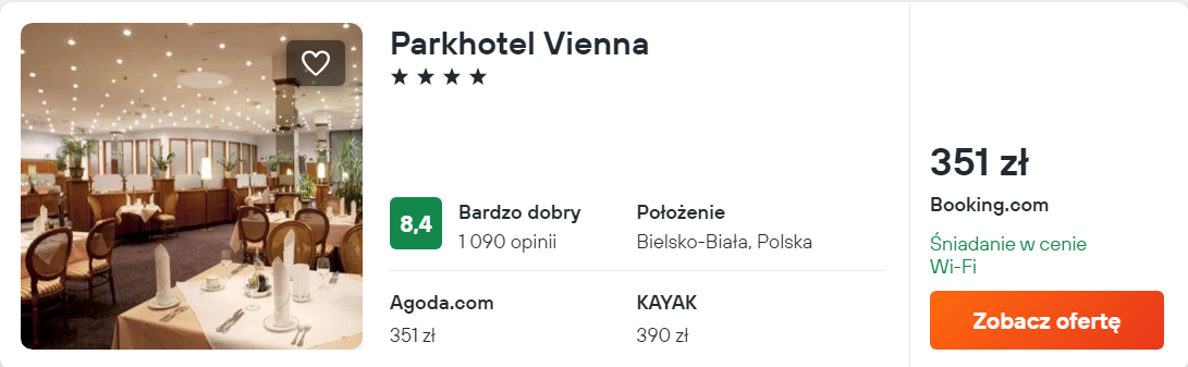 W Bielsku-Białej wybrałem 4* hotel Vienna. W twoim pokoje będzie TV, balkon, prywatna łazienka i dostęp do WiFi. Otrzymasz również śniadanie wliczone w cenę noclegu.