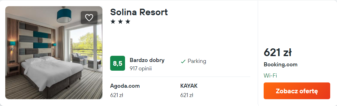 Natomiast najdroższe będą noclegi w Solina Resort. Obiekt mieści się niedaleko jeziora i oferuje swoim gościom strefę relaksu i nowocześnie urządzone pokoje z balkonami.