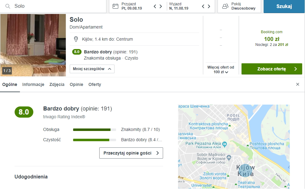 Przeloty realizowane są na pokładzie węgierskiej linii lotniczej Wizz Air. Aby uzyskać taką cenę, musisz być członkiem Wizz Discount Club. Apartament Solo leży na lewym brzegu rzeki Dniepr, 100 metrów od stacji metra Pozniaki. Pokoje są prosto zaprojektowane i wyposażone w niezbędne dodatki. Do waszej dyspozycji jest prywatna łazienka w pokoju.
