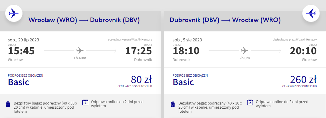 Do Chorwacji udasz się w gorącym szczycie sezonu: 29 lipca – 5 sierpnia. Do Dubrownika polecisz bezpośrednio z Wrocławia na pokładzie samolotu linii lotniczej Wizz Air. Najtańsze bilety zakupią posiadacze Wizz Discount Club, pozostałe osoby zapłacą nieco więcej. W cenę wliczono podróż z samym bagażem podręcznym.