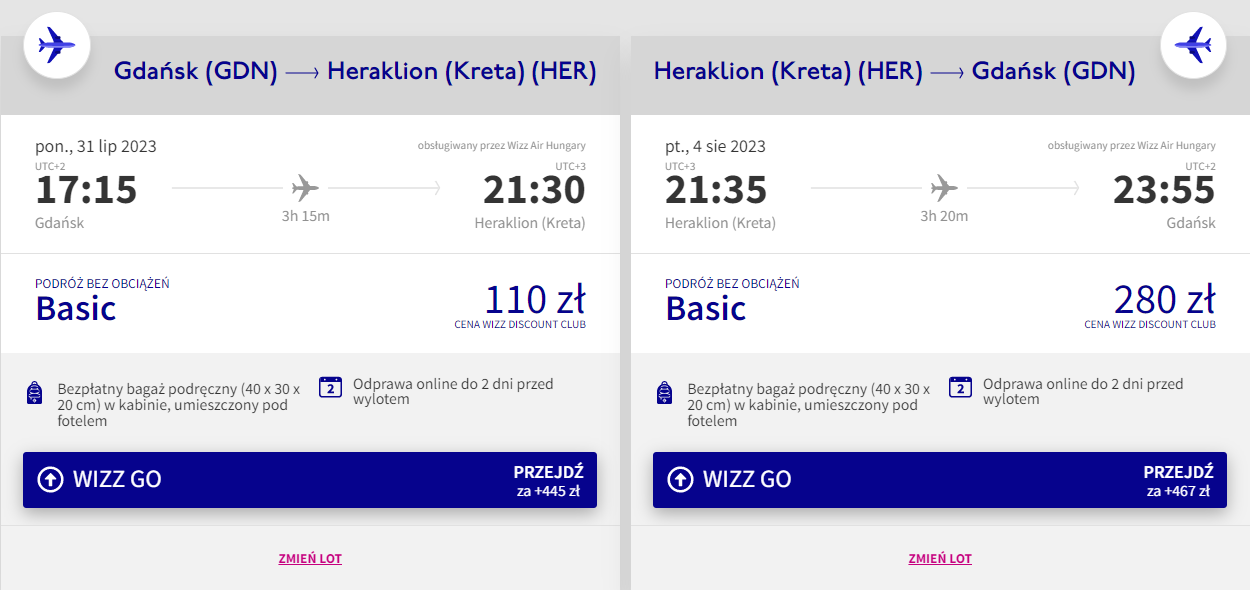 Na Kretę udasz się z gdańskiego portu lotniczego im. Lecha Wałęsy w terminie 31 lipca – 4 sierpnia. W obie strony polecisz na pokładzie samolotu linii Wizz Air. Bilety w najniższej cenie dostępne są dla osób z Wizz Discount Club. Chętni na loty bez WDC zapłacą nieco więcej.