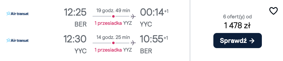 Do Kanady wybierzesz się w czerwcu i lipcu 2025 r. z Berlina. Do Toronto i Calgary polecisz linią Air Transat. W cenę biletu wliczony jest bagaż podręczny.