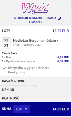 Zarezerwuj przelot z Bergamo do Gdańska (Wizz Air) za 14.99 EUR (ok. 64 PLN):