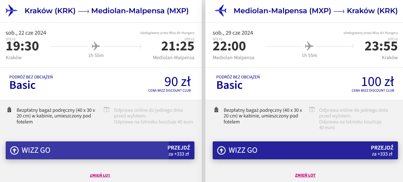 Do Lombardii udasz się w terminie 22-29 czerwca z krakowskiego lotniska w Balicach. Podróż odbędziesz linią lotniczą Wizz Air. W cenę biletu wliczony jest bagaż podręczny.