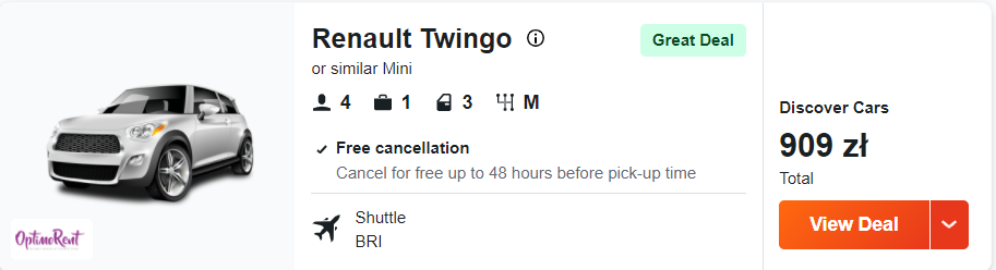 Najlepszym sposobem na eksplorację południowych rejonów Włoch jest poruszanie się samochodem. Dlatego zachęcam was do wypożyczenie auta zaraz po przylocie do Bari. W sezonie wakacyjnym najmniej zapłacicie za wynajem samochodu Renalut Twingo lub podobnego.