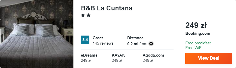 Dowiedzcie się więcej o tym hoteluNatomiast w Potenzie proponuję wam zakwaterowanie (ze śniadaniami) w obiekcie B&B La Cuntana, który znajduje się w samym centrum miasta. W jego sąsiedztwie mieści się publiczny parking.