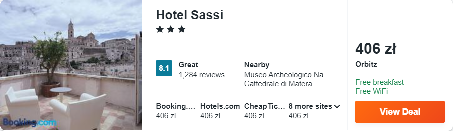 Dowiedzcie się więcej o tym hoteluW miejscowości Mater polecam wam noclegi z codziennymi śniadaniami w 3* hotelu Sassi, który mieści się w najstarszej dzielnicy miasta, w odległości paru minut spacerem od jego głównych atrakcji.