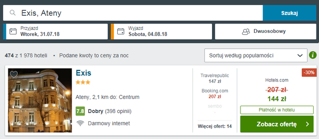Z wielu dostępnych opcji zakwaterowania w Atenach, wybrałem dla Was ofertę pobytu w Exis Hotel za 144 PLN/pokój za noc. Narodowe Muzeum Archeologiczne oraz najbliższa stacja metra oddalona jest od obiektu 7 minut spacerem. Wszystkie pokoje zostały przepięknie urządzone w różnych stylach i zapewniają łóżko typu king-size, telewizor, łazienkę z prysznicem oraz ogrzewanie i klimatyzację.
