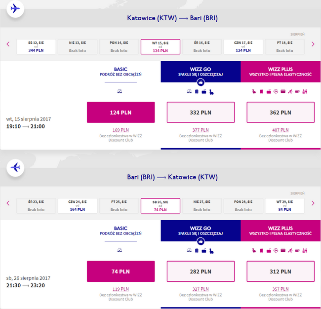 Za bilety zapłacicie dowolną kartą płatniczą. Bez dodatkowych opłat do Bari podróżować będziecie tylko z małym bagażem podręcznym o maksymalnych wymiarach 42 x 32 x 25 cm. Najtańsze bilety są dostępne dla członków Wizz Discount Club. Pozostali zapłacą nieco więcej.