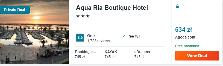 Dowiedzcie się więcej o tym hoteluNatomiast w słonecznym Faro rekomenduję wam noclegi z codziennymi śniadaniami w 3* hotelu Aqua Ria Boutique, który znajduje się w samym centrum miasta, w sąsiedztwie mariny oraz historycznego budynku – Arco da Vila.