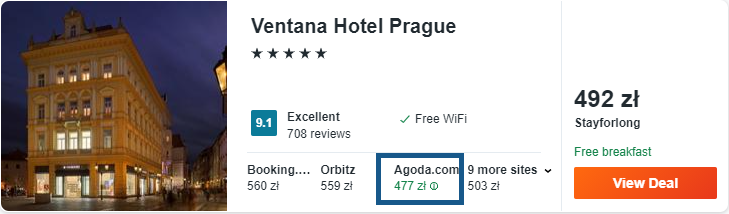 Jeżeli chcecie zaznać odrobiny luksusu i komfortu, to zainteresuje was oferta noclegów w bardzo dobrym 5* hotelu Ventana, który znajduje się w sąsiedztwie Starego Rynku. Obiekt mieści się w zabytkowym, neorenesansowym pałacu i oferuje elegancko urządzone, klimatyzowane pokoje. Z hotelu roztacza się widok na kościół Marii Panny przed Tynem, Drogę Królewską lub Rynek Starego Miasta. W cenę zostały wliczone codzienne śniadania. Najlepszą ofertę uzyskacie wybierając pośrednika Agoda.
