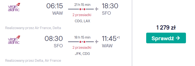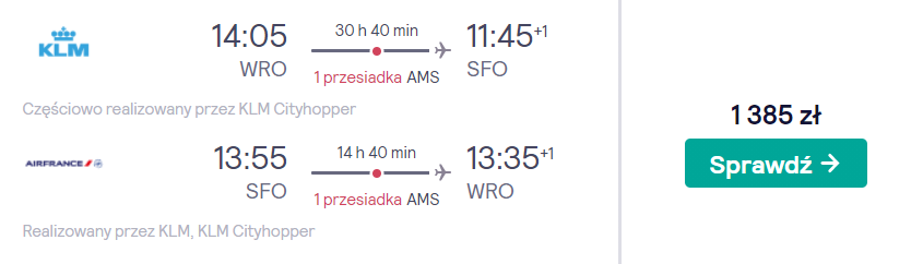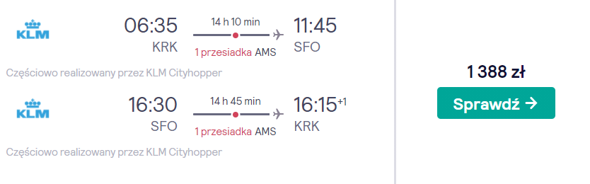 Sprawdźcie dostępne terminy z lotami z Warszawy do San Francisco (KLM): 1-15 lipca, 1-22 lipca, 8-25 lipca oraz 10-25 sierpnia.