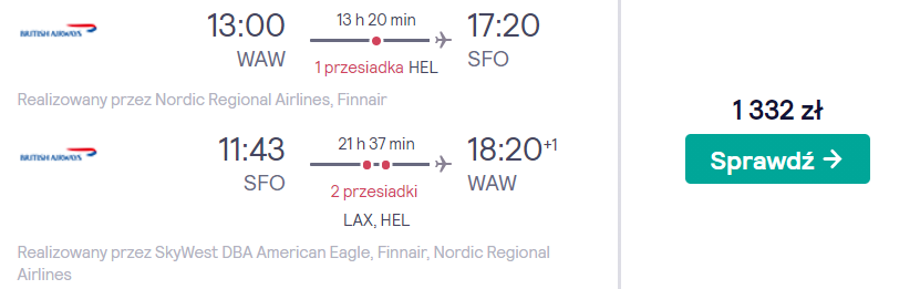 Sprawdźcie dostępne terminy z lotami z Warszawy do San Francisco (British Airways): 3-25 lipca, 4-17 lipca, 12-26 lipca, 16-25 lipca, 18-31 lipca, 1-14 sierpnia, 2-13 sierpnia, 7-21 sierpnia oraz 16-28 sierpnia.