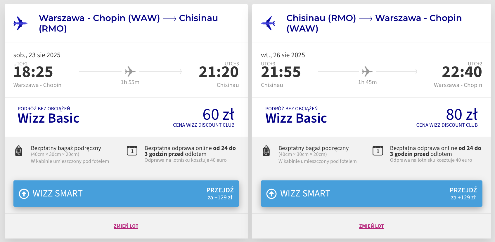 Do Mołdawii wybierzesz się w terminie 23-26 sierpnia (sobota-wtorek) z lotniska w Warszawie. W obie strony polecisz linią Wizz Air z bagażem podręcznym. Bilety w najniższej cenie dostępne są dla członków Wizz Discount Club.
