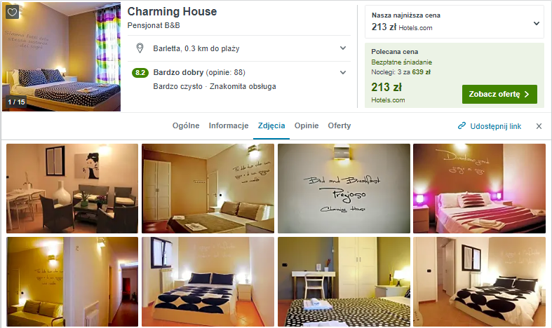 Wybrałem dla was zakwaterowanie Barletcie w bardzo dobrze ocenianym pensjonacie z codziennymi śniadaniami wliczonymi w cenę noclegu. Jest on położony 5 minut spacerem od plaży. Z lotniska w Bari łatwo dostaniecie się tam pociągiem.