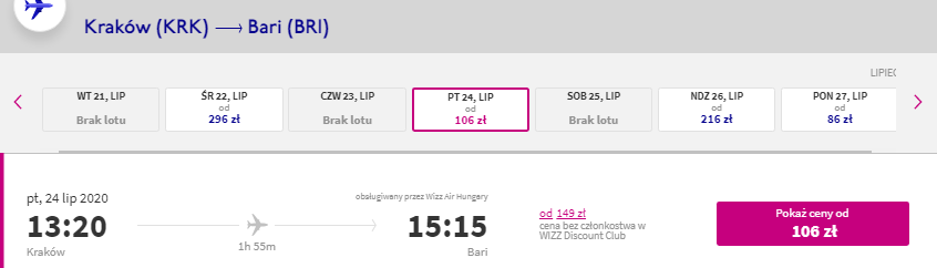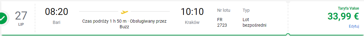 Z krakowskiego lotniska wylecicie w piątek o godzinie 13:20, po dwóch godzinach przylecicie do Bari. Lot powrotny jest zaplanowany w poniedziałek o godzinie 08:20.