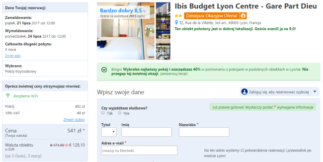 - Zakwaterowanie w Ibis Budget Lyon La Part-Dieu za 541 PLN/2 osoby/3 nocy (270,5 PLN/osoba)