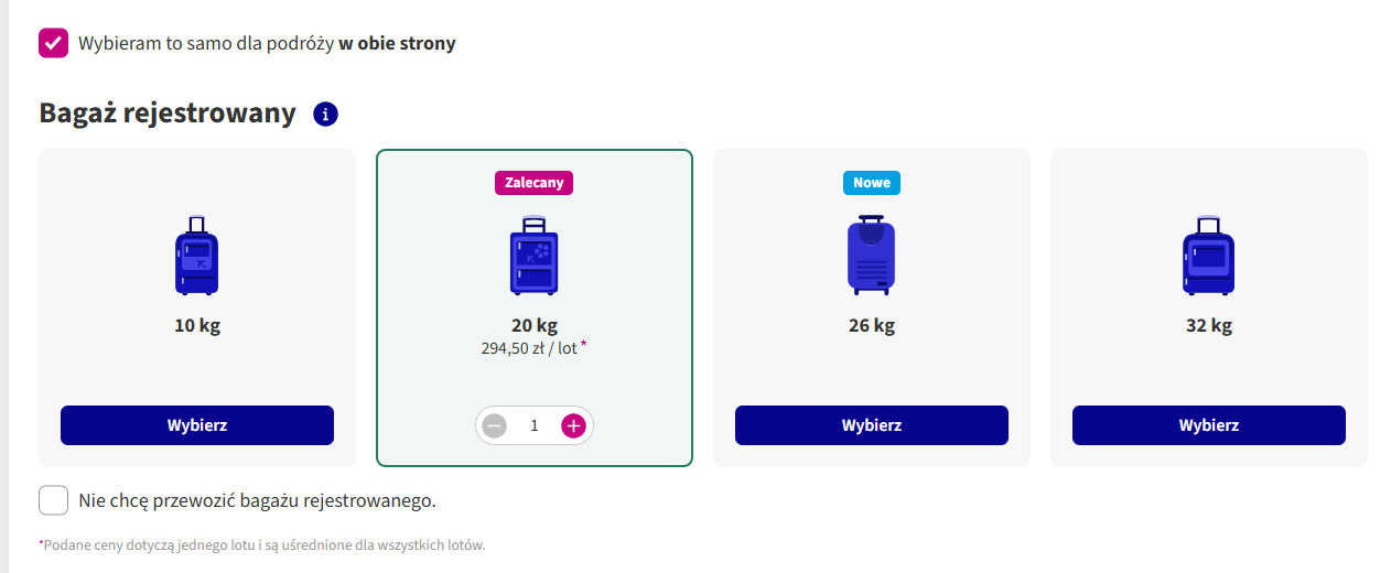 🧳 Bagaż: podręczny 40x30x20 cm, maks. 10 kg