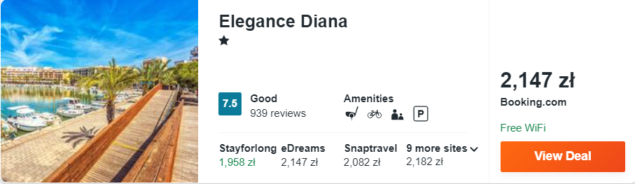 Na Majorce rekomenduję wam noclegi w hotelu Elegance Diana, który mieści się naprzeciw mariny w miejscowości Alcudia. Odległość od najbliższej plaży wynosi tylko 350 metrów. W obiekcie zakwaterowani zostaniecie w dwuosobowym pokoju wyposażonym w klimatyzację, telewizor LCD, zestaw do parzenia kawy lub herbaty oraz lodówkę. W prywatnej łazience znajduje się prysznic, podstawowe przybory toaletowe oraz suszarka do włosów. Na terenie całego obiektu korzystać będziecie mogli z dostępu do sieci WiFi.
