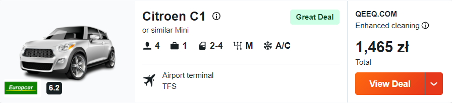 Jeżeli poza relaksem interesuje was także zwiedzanie, to zachęcam was do wypożyczenia samochodu zaraz po przylocie na Teneryfę. W sezonie wakacyjnym za wynajem samochodu Citreon C1 lub podobnego modelu zapłacicie 209 PLN/doba.