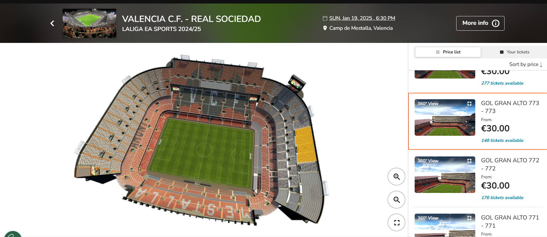 W cenę pakietu wliczyłem także bilet na mecz w ramach rozgrywek La Liga (Valencia C.F. – Real Sociedad), który zaplanowany jest na niedzielę 19 stycznia na godzinę 18:30. Wejściówkę w wolnej sprzedaży kupisz na oficjalnej stronie drużyny z Walencji.