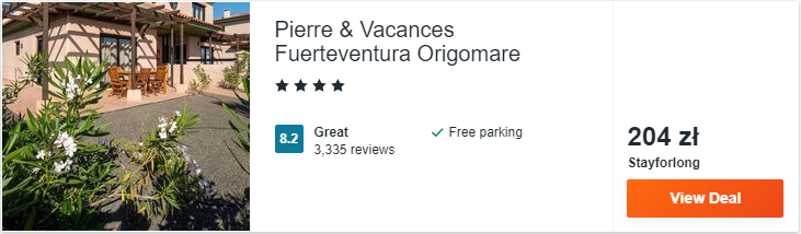 Na Fuerteventurze wybrałem dla was zakwaterowanie w 4* hotelu Pierre & Vacances Resort. Będziecie mieli do dyspozycji przestronne, klimatyzowane pokoje z prywatną łazienką. Istnieje możliwość bezpłatnego odwołania rezerwacji.