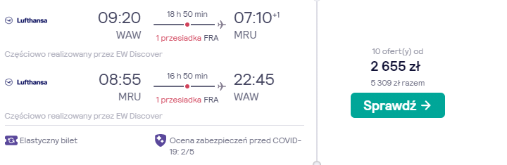 W egzotyczną podróż na Mauritius wyruszycie dopiero w przyszłym roku, w terminie obejmującym walentynki: 6(7) – 17 lutego 2022 r. Czekają was loty z lotniska w Warszawie, realizowane na pokładzie samolotów 5* linii lotniczej Lufthansa (to jedyny przewoźnik z Europy, wyróżniony najwyższą oceną przez Skytrax). Po drodze zaplanowano bezpieczne, gwarantowane przez przewoźnika przesiadki we Frankfurcie.