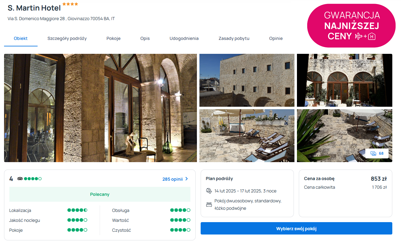 Będziesz zakwaterowany w nadmorskiej miejscowości Giovinazzo. Zatrzymasz się w bardzo dobrze ocenianym 4* hotelu S. Martin. Dla gości przygotowano klimatyczne, tradycyjnie urządzone wnętrza, taras na dachu budynku oraz codzienne śniadania.
