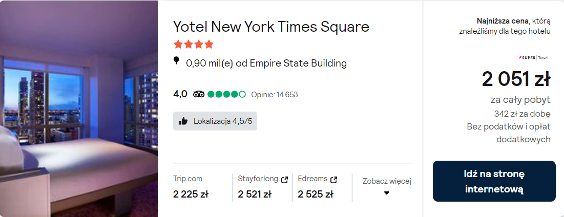 Na miejscu zatrzymasz się w 4* hotelu Yotel New York Times Square, który od słynnego placu oddalony jest o 1 km! Z lotniska JFK w okolice miejsca noclegowego (stacja metra 42 St – Port Authority Bus Terminal) dojedziesz komunikacją publiczną.