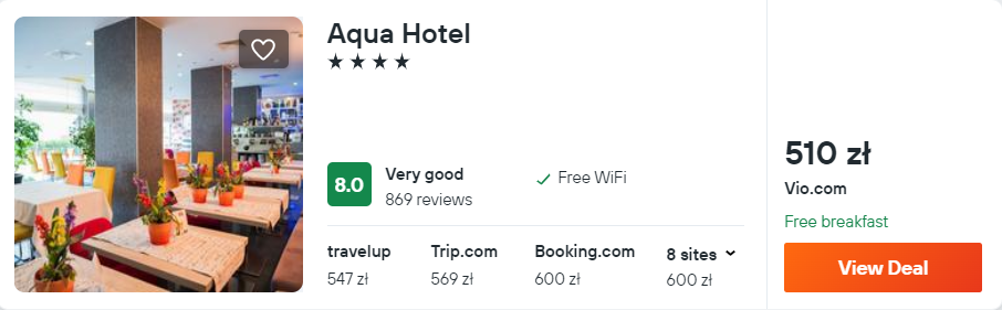 W Warnie polecam ci noclegi z codziennymi śniadaniami w 4* hotelu Aqua. Każdy pokój wyposażony jest w klimatyzację z funkcją ogrzewania, telewizor LCD oraz minibar. W łazience jest prysznic, suszarka do włosów oraz podstawowe przybory toaletowe. Na terenie całego obiektu będziesz mieć zapewniony dostęp do sieci WiFi.