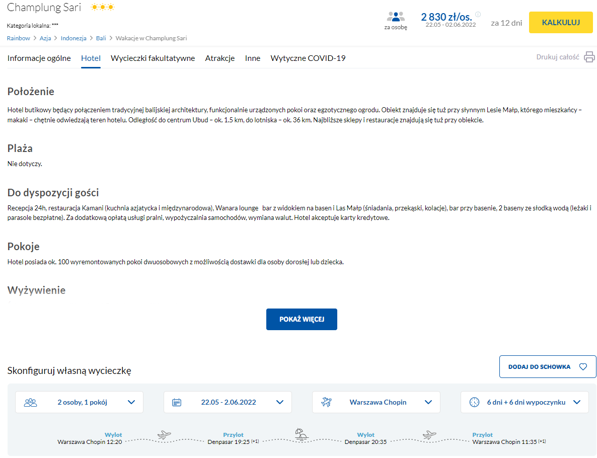 Na Bali udacie się w terminie 22(23) maja – 2(3) czerwca. Czeka was bezpośredni lot z Warszawy do Denpasar, z wliczonym bagażem rejestrowanym (nadawanym do luku). To znaczy, że tym razem nie będzie problemu ze spakowaniem wszystkich potrzebnych rzeczy.