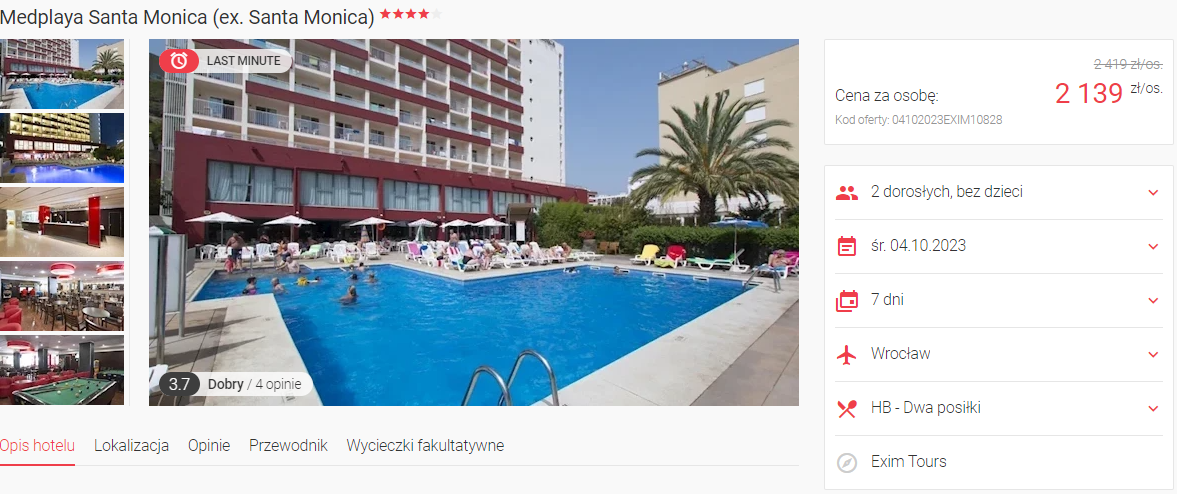 Urlop spędzisz w 4* hotelu Medplaya Santa Monica. Obiekt znajduje się w niedalekiej odległości od piaszczystej plaży. Do twojej zostanie oddany basen zewnętrzny z tarasem słonecznym oraz przytulnie urządzony pokój z prywatną łazienką, klimatyzacją oraz balkonem.