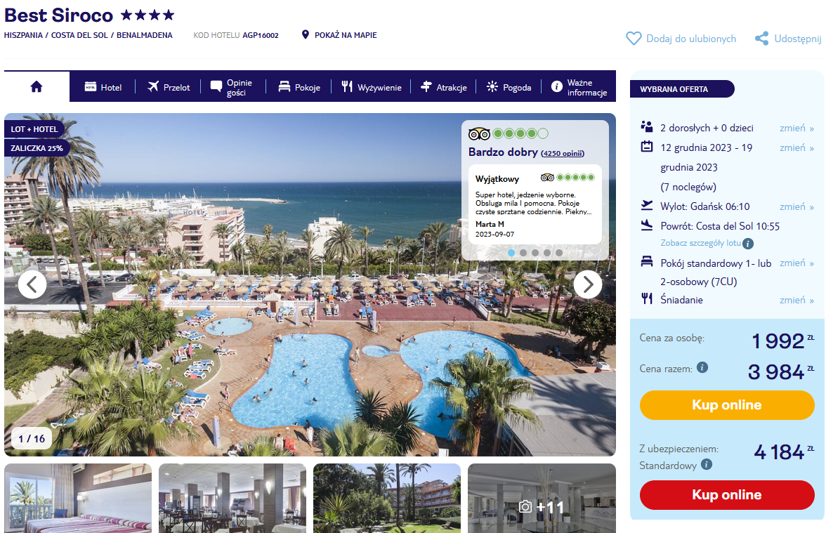 Wycieczka do Hiszpanii zaplanowana została w terminie 12 – 19 grudnia. Czeka cię bezpośredni lot z jednego z 2 poslkich miast do Malagi, realizowany na pokładzie samolotu linii lotniczych Wizz Air. W cenę pakietu wliczono podróż z bagażem podręcznym i rejestrowanym (nadawanym do luku).