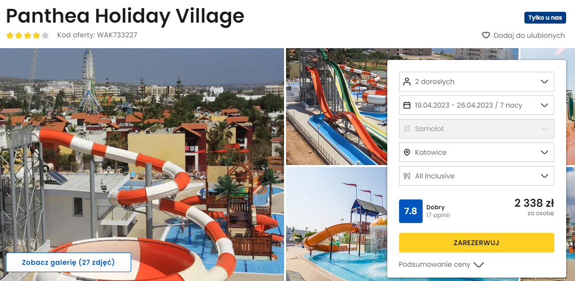 Na Cyprze będziesz zakwaterowany w 4* hotelu Panthea Holiday Village. Znajduje się on w najsłynniejszym kurorcie na wyspie – Aija Napa – i poza wyżywieniem w formie zróżnicowanej oferty all inclusive, oferuje dostęp do basenu z imponującym kompleksem zjeżdżalni.