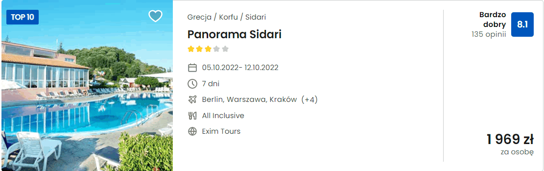 Wycieczka do Grecji zaplanowana została w terminie 5 – 12 października. Czeka was bezpośredni lot na Korfu, a jako miejsce wylotu macie do wyboru aż 8 miast.