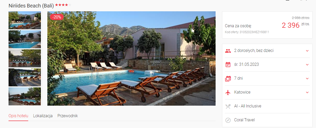 Oferta zawiera wyżywienie w formule all inclusive, podstawowe ubezpieczenie oraz bagaż rejestrowany.
