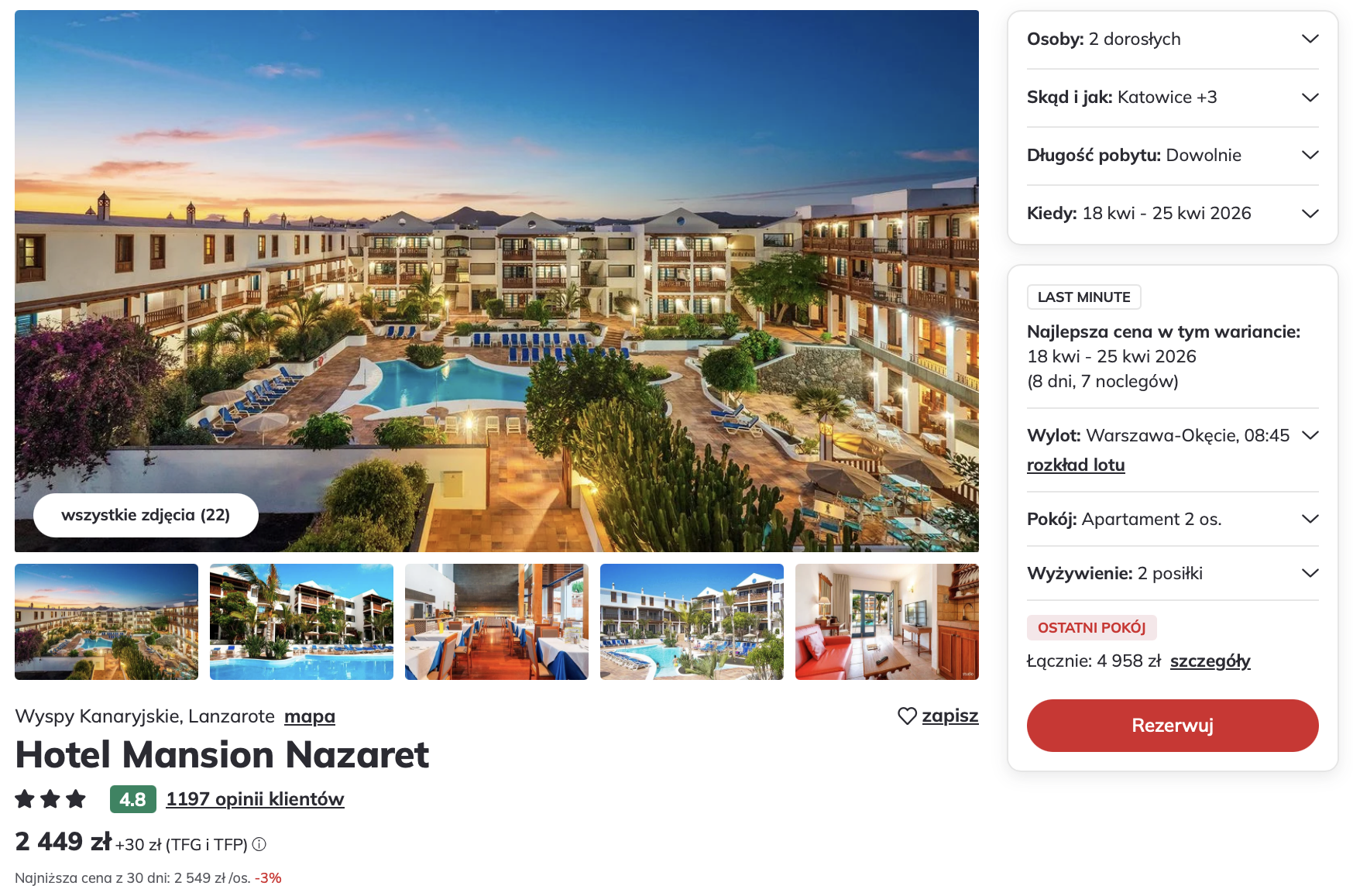 Na miejscu czeka 3* hotel Mansion Nazaret w centrum Costa Teguise, w pobliżu piaszczystej plaży. Hotel prowadzony jest przez właścicielkę wraz z rodziną i słynie z kameralnej atmosfery oraz gościnności. Goście chwalą poranny rytuał: świeże bułeczki dostarczane z pobliskiej piekarni, tradycyjne drewniane meble i bogatą kuchnię z lokalnymi potrawami. Obiekt dysponuje trzema basenami, w tym dwoma podgrzewanymi, a także brodzikiem. Na terenie hotelu dostępne są przestronne 3-osobowe apartamenty z aneksami kuchennymi. To propozycja dla tych, którzy cenią spokój i autentyczny klimat zamiast rozbudowanej infrastruktury hotelowej.