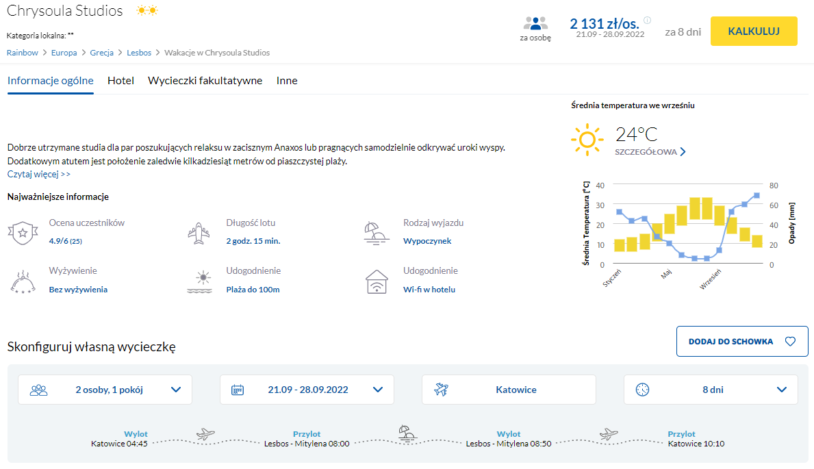 Na wycieczkę do Grecji udacie się w terminie 21 – 28 września. Czeka was bezpośredni lot z Katowic do Mityleny, z wliczonym bagażem rejestrowanym (nadawanym do luku). Oznacza to, że tym razem nie będziecie musieli iść na kompromisy w czasie pakowania się!
