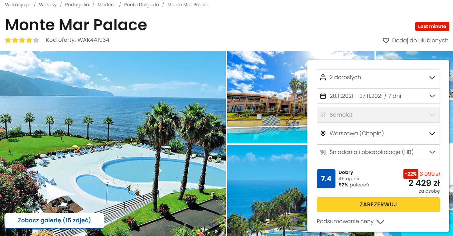 Na wycieczkę do Portugalii wybierzecie się już niedługo, w terminie 20 – 27 listopada. Na Maderze zakwaterowani będziecie w świetnym 4* hotelu Monte Mar Palace, który położony jest bezpośrednio przy oceanie. Do dyspozycji gości oddano basen, siłownię, boisko do squasha, centrum spa & wellness, bar oraz restaurację.